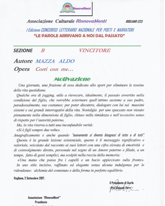 8 Settembre 2017 Concorso Letterario Nazionale “LE PAROLE ARRIVANO A NOI DAL PASSATO”1° Classificato Sezione E – Racconto Breve. Cerimonia di Premiazione Comune DI Rogliano (CS) |