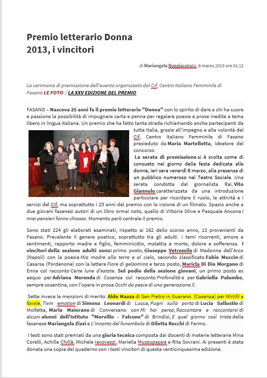 8 marzo 2013 Premio Letterario Nazionale "Donna", XXV Edizione. Menzione Di merito Sezione Narrativa Inedita. Cerimonia di Premiazione Teatro Sociale di Fasano (Brindisi) |